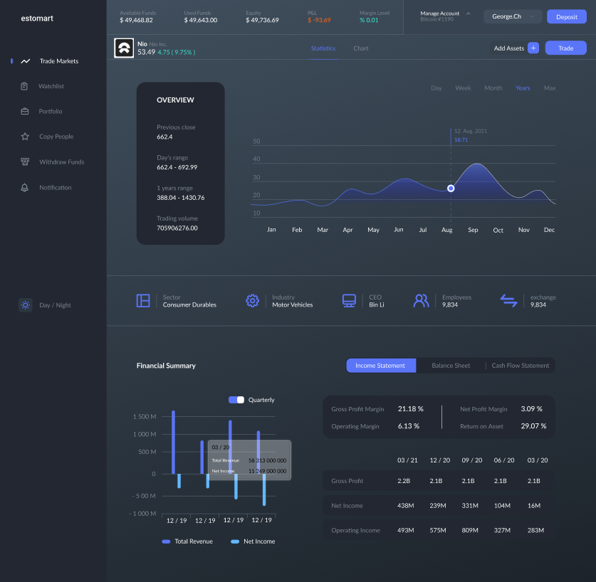 Led frontend development for a comprehensive trading ecosystem, including both user-facing trading interfaces and internal admin platforms. Defined frontend architecture, led a team, and built complex dashboards with advanced charts and real-time data visualization.